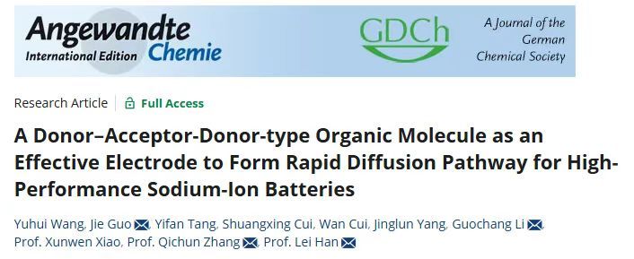 Yuhui Wang, Jie Guo,* Yifan Tang, Shuangxing Cui, Wan Cui, Jinglun Yang, Guochang Li,* Xunwen Xiao, Qichun Zhang,* Lei Han*, A Donor-Acceptor-Donor-type Organic Molecule as an Effective Electrode to Form Rapid Diffusion Pathway for High-Performance Sodium-Ion Batteries, Angew. Chem. Int. Ed., 2025, e202513887.